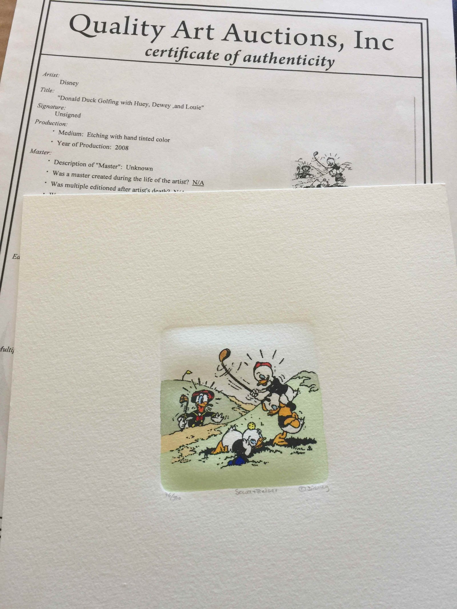 4. Donald Duck Golfing with Family Etching with hand tinted color 2008 Disney  Hand tinted Etching COA Sowa and Reiser.